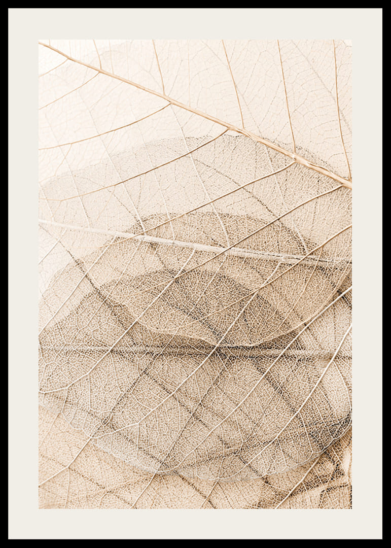 Het motief bestaat uit meerdere dunne bladeren die overlappende lagen vormen, waarbij de heldere nerven een netvormig patroon vormen in zachte beige- en bruintinten. De lichte en luchtige uitstraling past goed in minimalistische omgevingen. De botanische poster brengt subtiele accenten van de natuur in de woonkamer of op de werkplek.