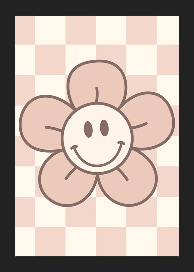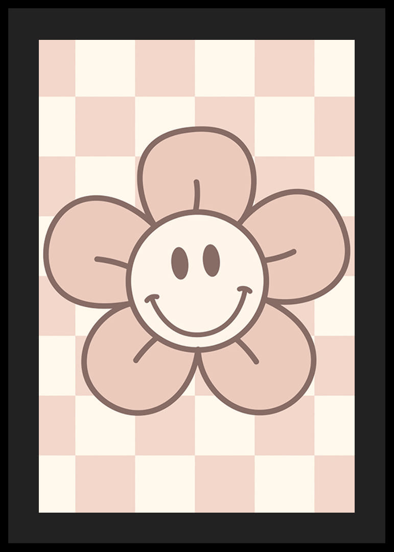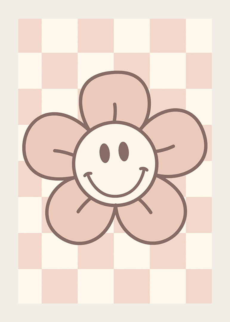 Het motief bestaat uit een gestileerde bloem met een lachend gezichtje in het midden, getekend met duidelijke contouren en zachtroze en beige tinten. De geblokte achtergrond in lichtroze en wit zorgt voor een grafische uitstraling. Zo'n poster creëert een speelse en prettige sfeer in kinderkamers of creatieve ruimtes.