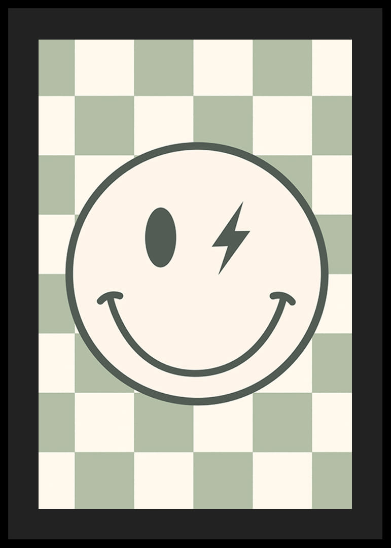 Het motief bestaat uit een grote, grafische smiley met één oog vervangen door een bliksemschicht en een ovaal oog, omlijst door een brede contourlijn. De achtergrond heeft een ruitjespatroon in groen en gebroken wit, wat een speels effect geeft. Deze poster combineert een eenvoudige vorm met een expressief design en is geschikt voor kinderkamers of speelhoeken.
