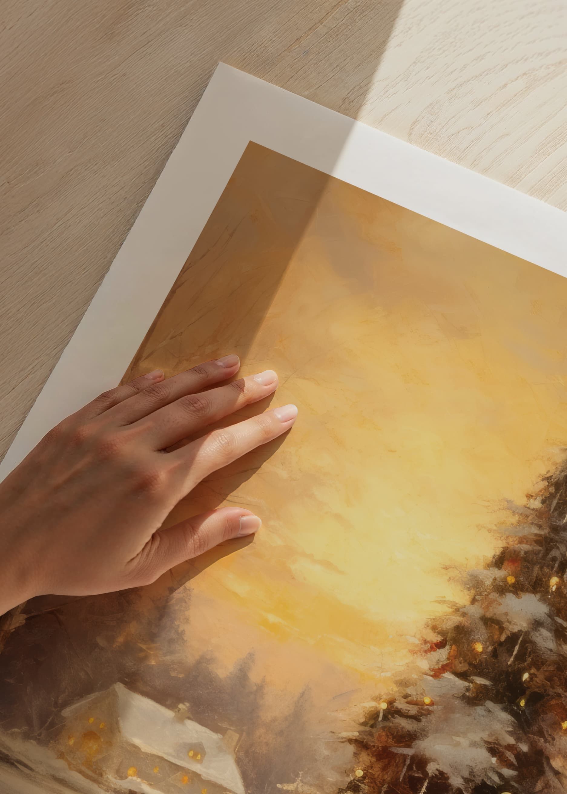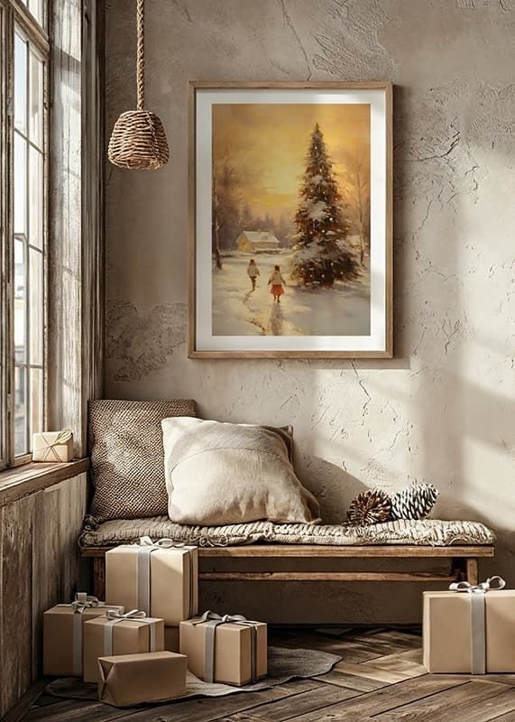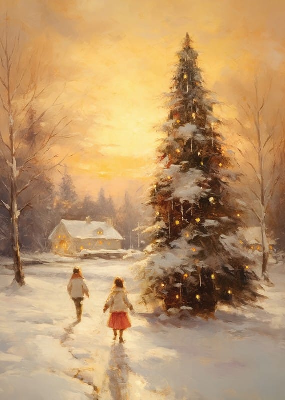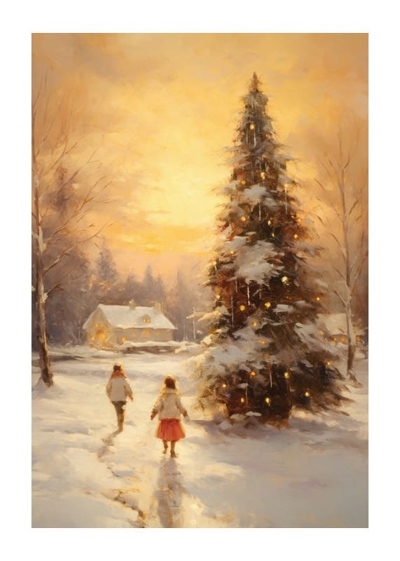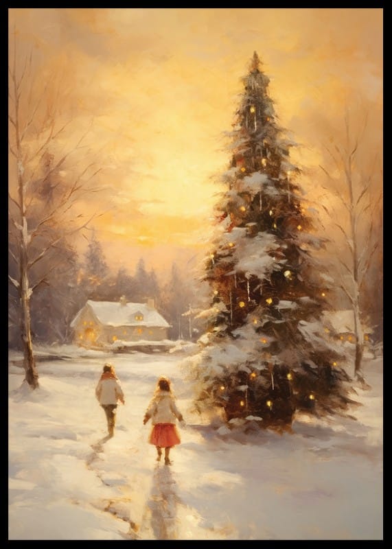Twee kinderen lopen naar een grote, met lichtjes versierde kerstboom in een besneeuwd winterlandschap, terwijl zachte tinten geel en oranje de zonsondergang weerspiegelen. Op de achtergrond zijn verlichte huizen en donkere bomen aan de horizon zichtbaar. Deze poster brengt een warme en sfeervolle wintersfeer in elk huis.