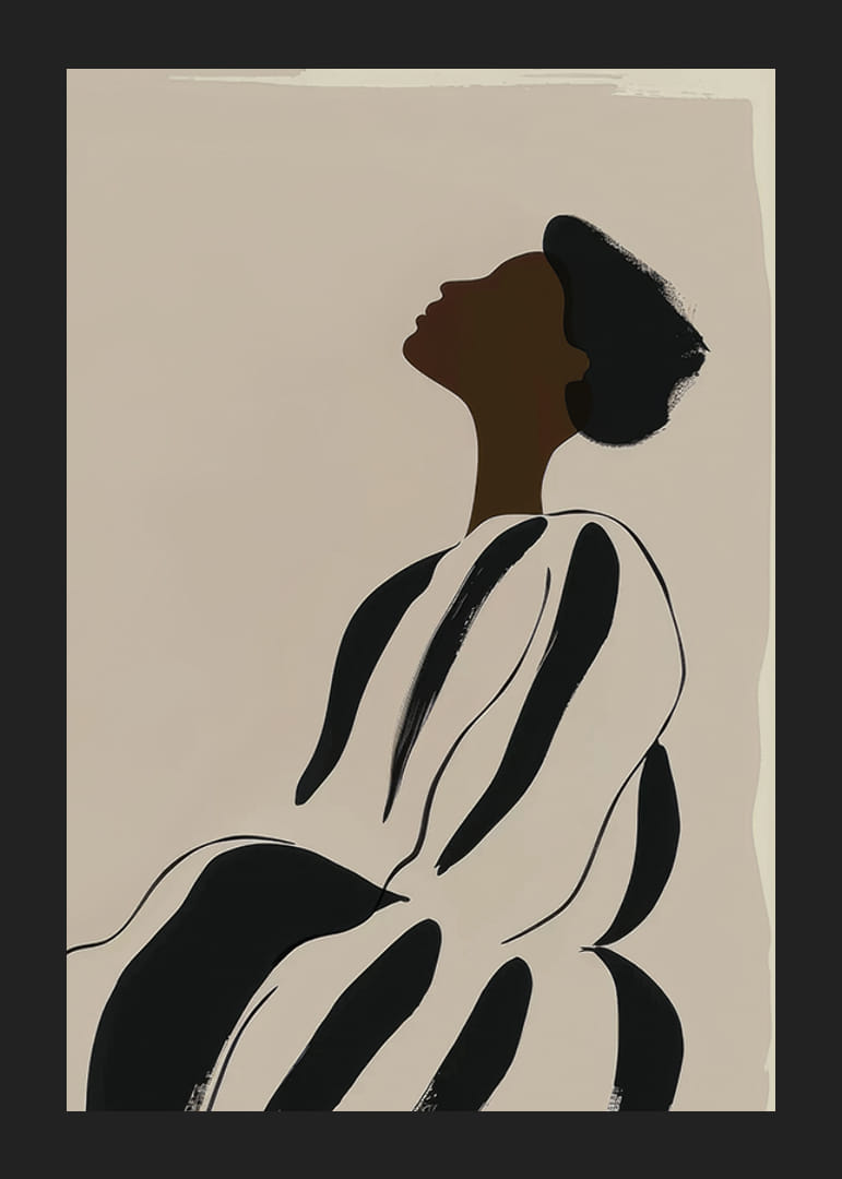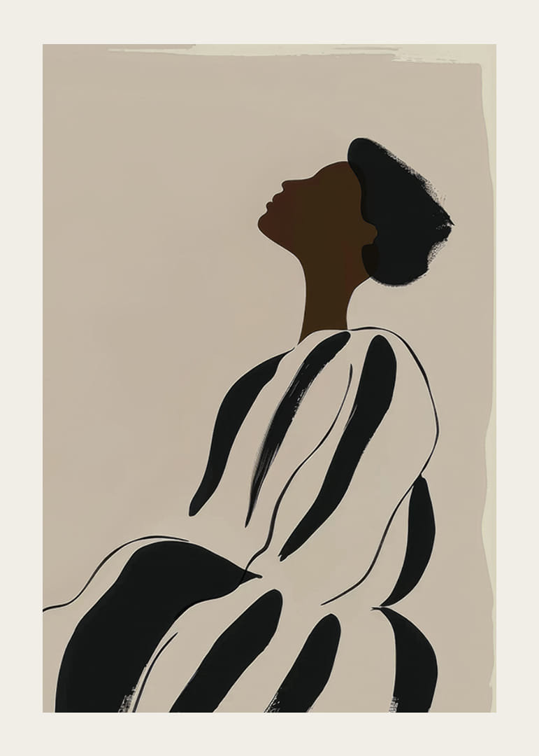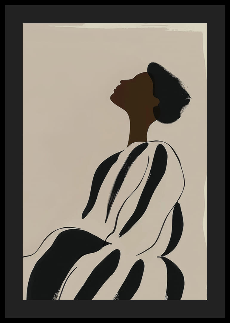 Poster met een minimalistische aquarelschilderij van een donkere vrouw in een gestreepte jurk.