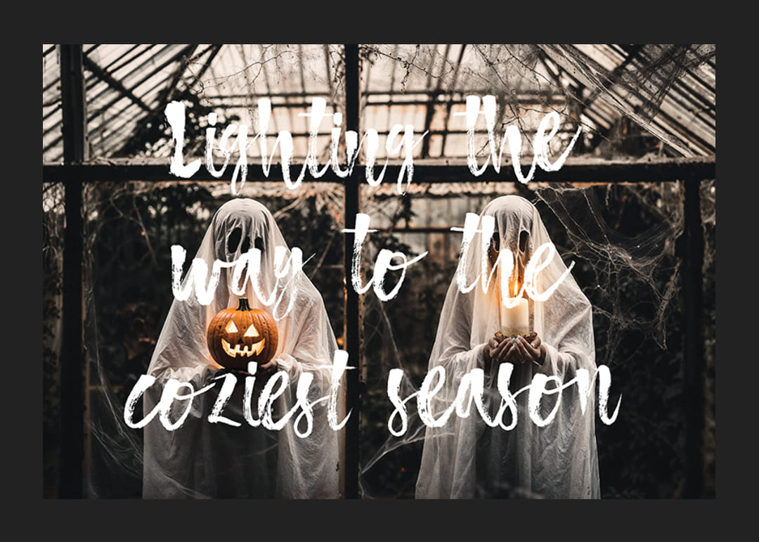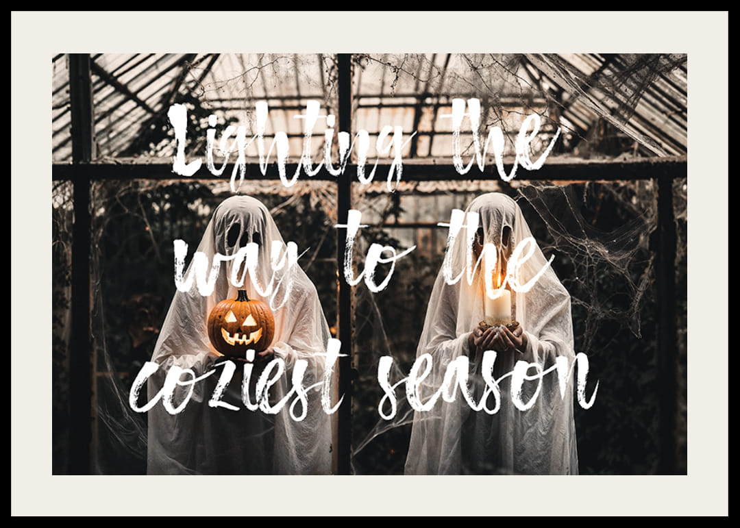 Deze poster combineert het griezelige met het gezellige, met twee spookachtige figuren in een verlaten kas, verlicht door een pompoenlantaarn en een kaars. De tekst ‘Verlicht de weg naar het gezelligste seizoen’ versterkt het gevoel dat de herfst zowel mysterieus als uitnodigend kan zijn. De donkere tinten en met spinnenwebben bedekte ruiten creëren een sfeer die zowel Halloween viert als het warme, omarmende gevoel van de herfst.