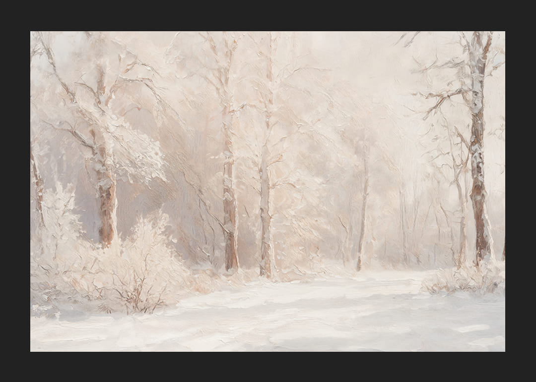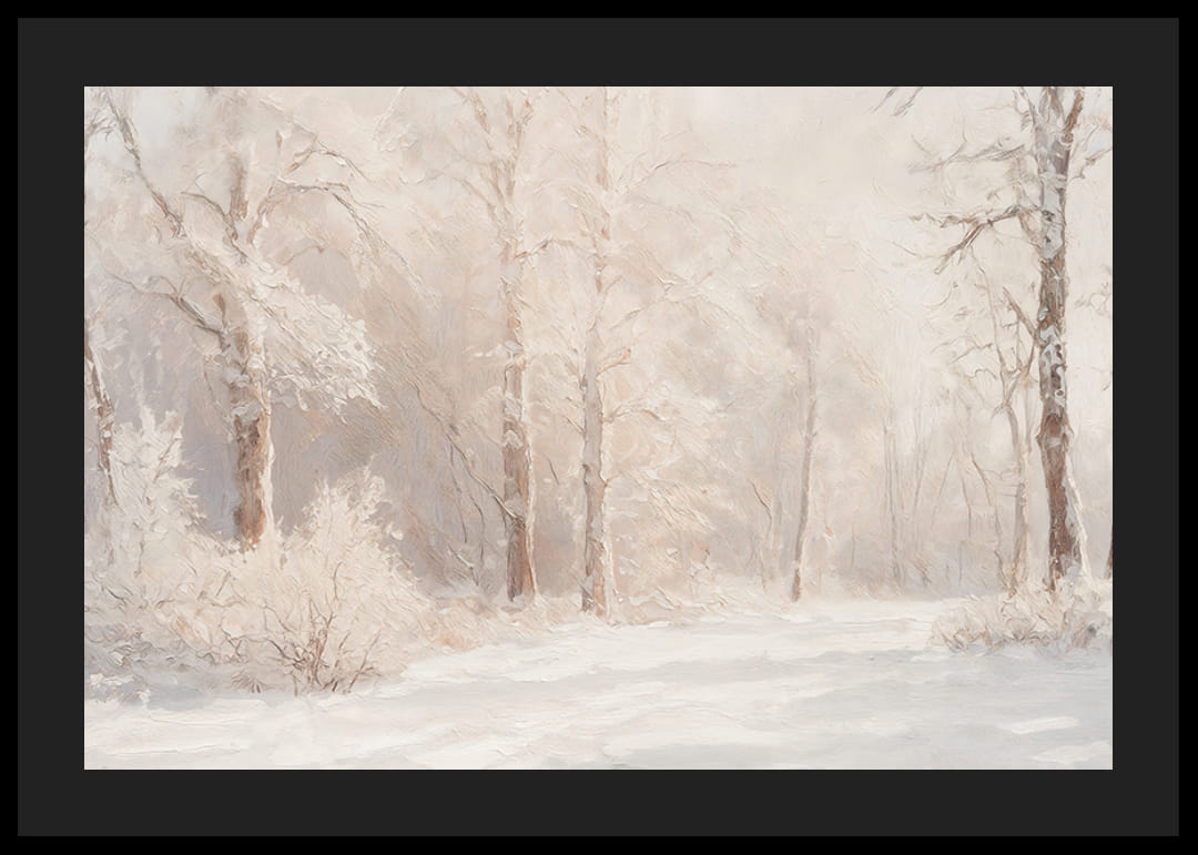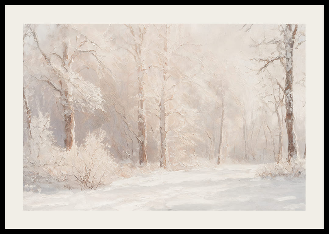 Creëer rust en harmonie met deze poster die de stilte van de natuur vastlegt in een met sneeuw bedekt boslandschap. De zachte, ijzige tinten en het gedempte licht geven een gevoel van rust en wintermagie. Perfect als decoratie om een ​​ontspannen sfeer te creëren of als cadeau voor natuurliefhebbers