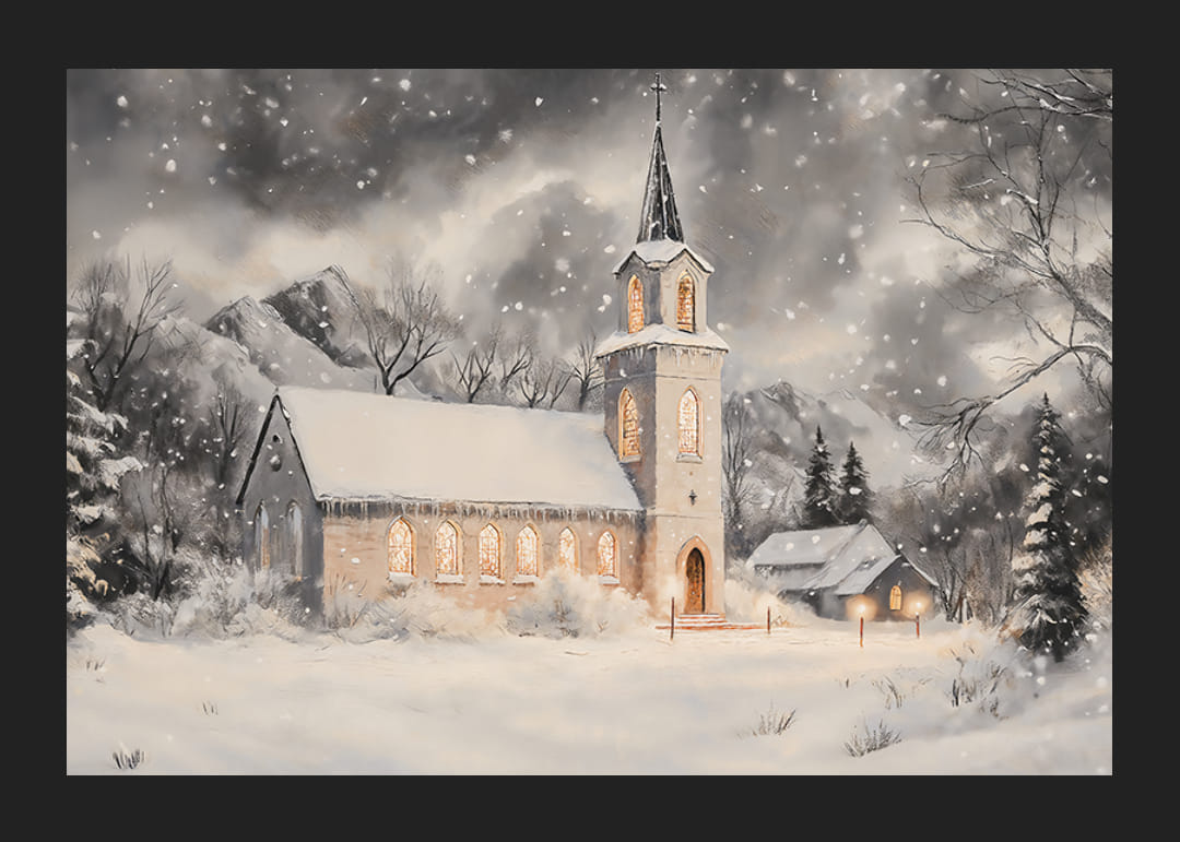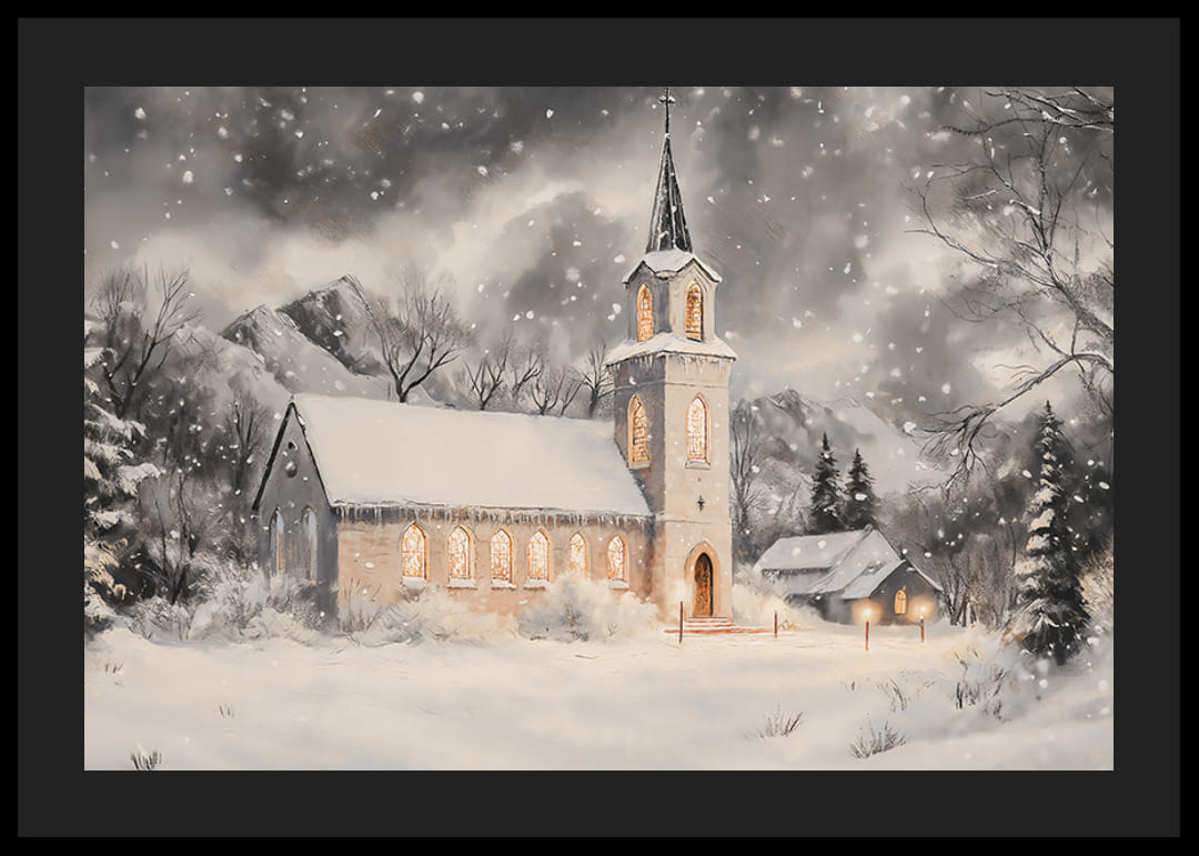 Leg de stilte van Kerstmis vast met deze prachtige poster met een afbeelding van een met sneeuw bedekte kerk waarvan het warme licht de koude winteravond verlicht. Met zijn zachte gloed door de matte ramen en het rustige, vredige landschap eromheen, herinnert dit tafereel aan de kalmte en toewijding van de feestdagen. Perfect om tijdens Kerstmis een gevoel van rust en bezinning in huis te creëren en voor iedereen die de schoonheid en traditie van de winter waardeert.