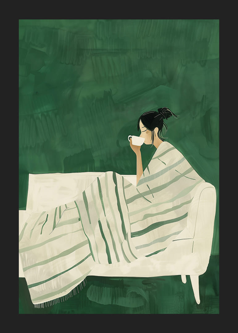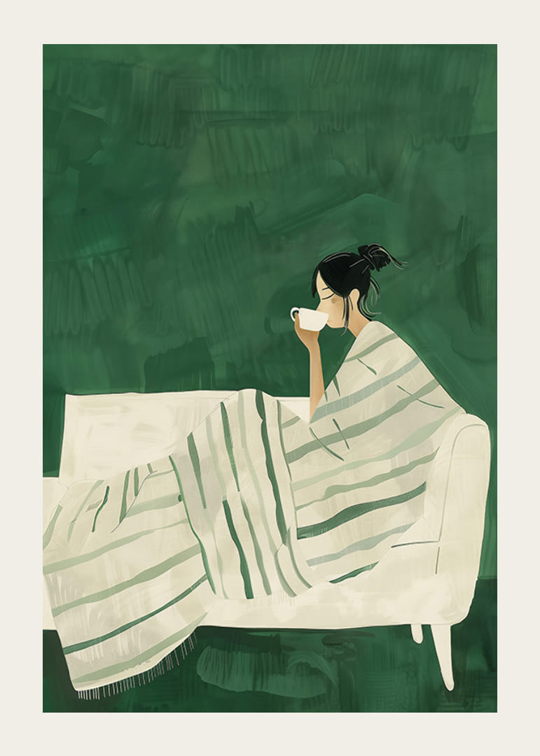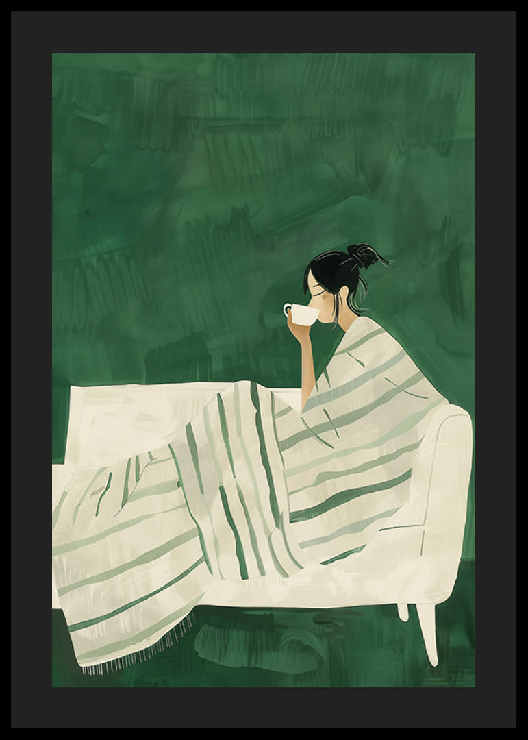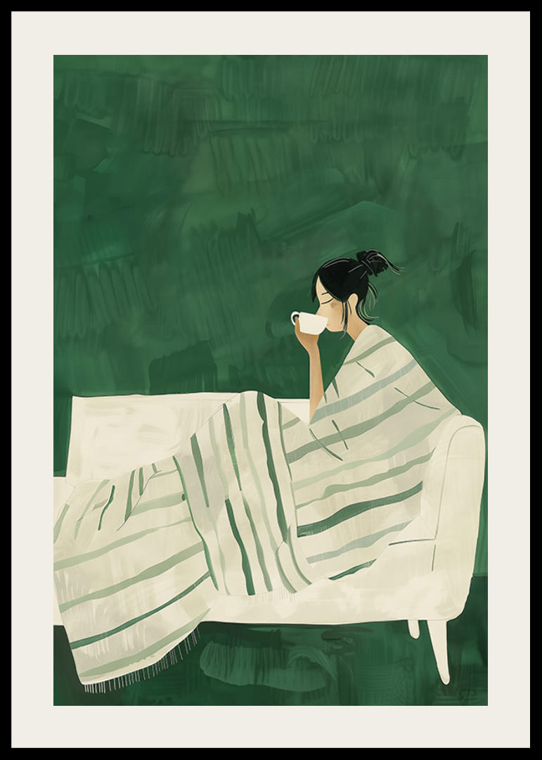Deze prachtige illustratie legt een moment van stilte en ontspanning vast. Een vrouw zit gewikkeld in een zachte, gestreepte deken op een witte bank en geniet van een kop warme thee of koffie. De rustige groene tinten en minimalistische uitstraling creëren een gevoel van harmonie en welzijn.